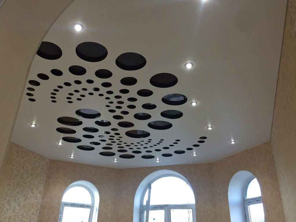 г. Медынь. Многоуровневый потолок: глянцевый серый потолок / перфорированное матовое полотно /белое полотно со светильниками.
