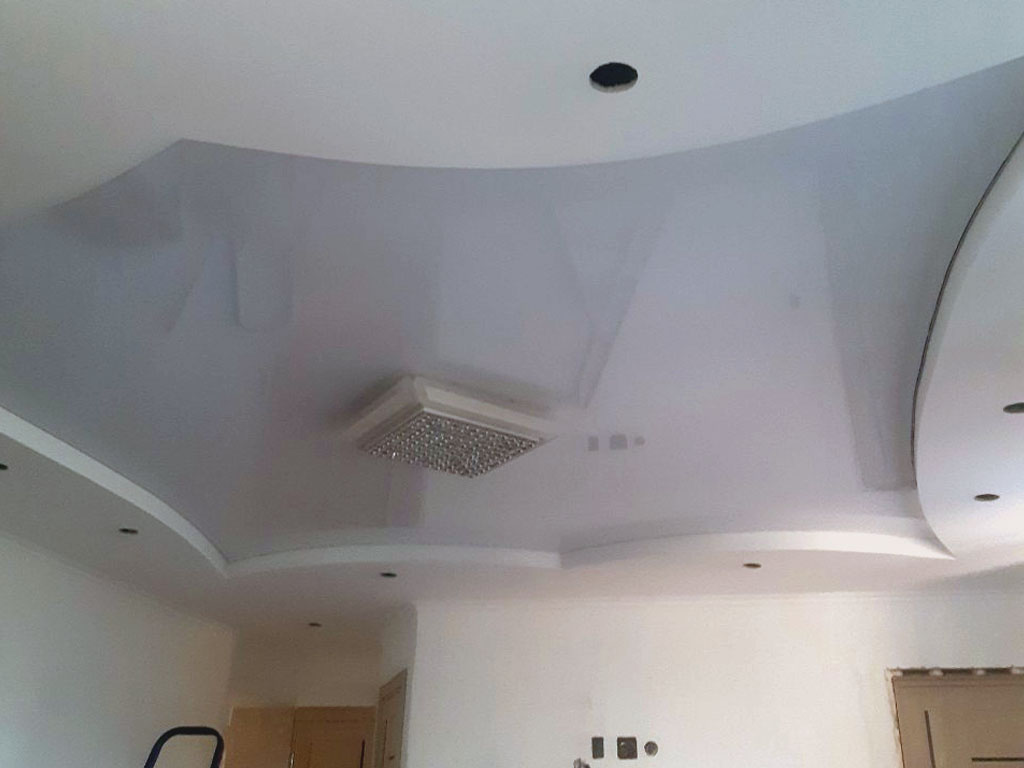 пос. Мятлево. Монтаж глянцевого натяжного потолка нестандартной формы внутри гипсокартонного каркаса.