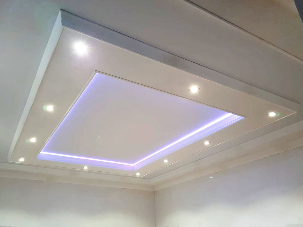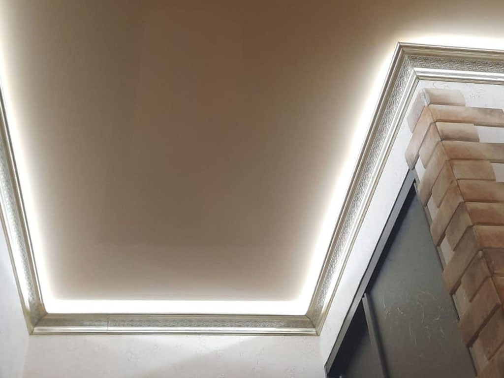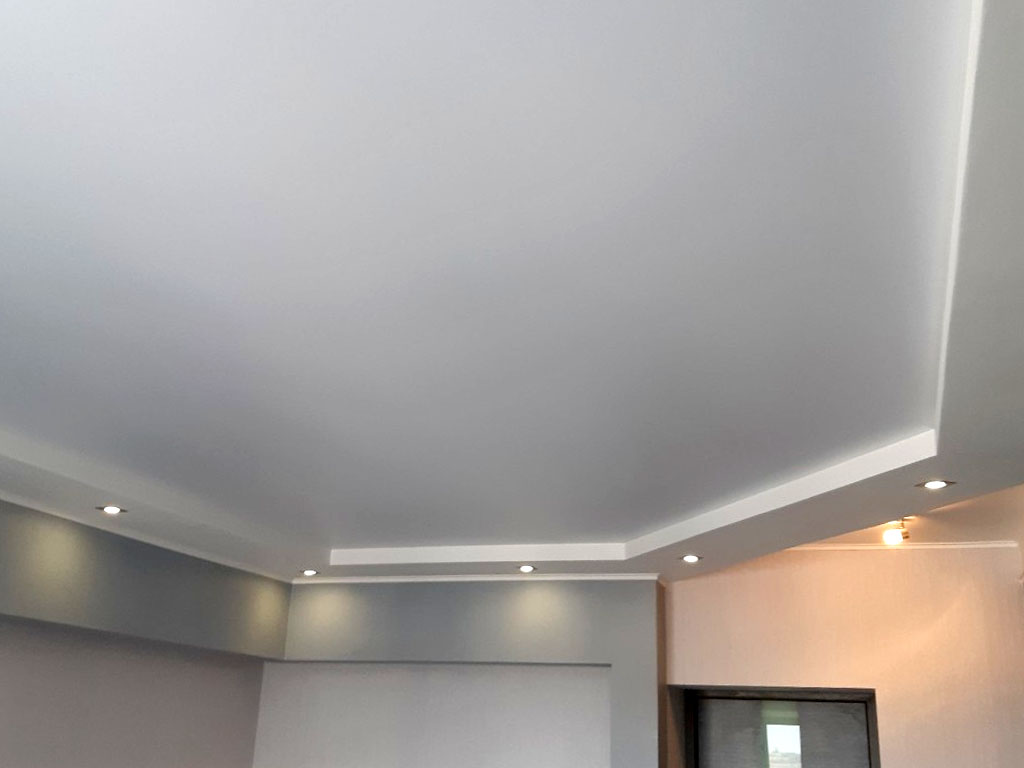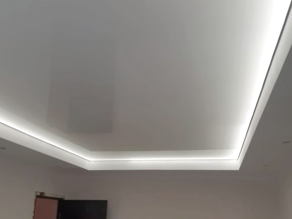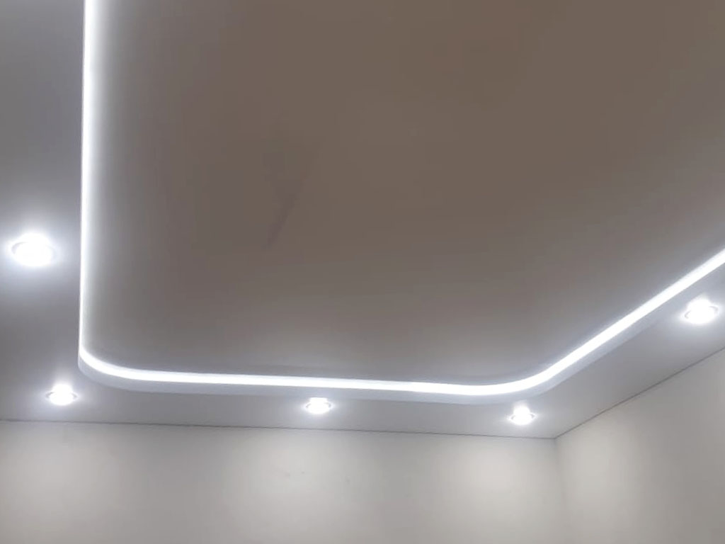 г. Медынь. Монтаж натяжного потолка с подготовкой короба. Подсветка: светодиодная лента, точечные светильники холодного света.