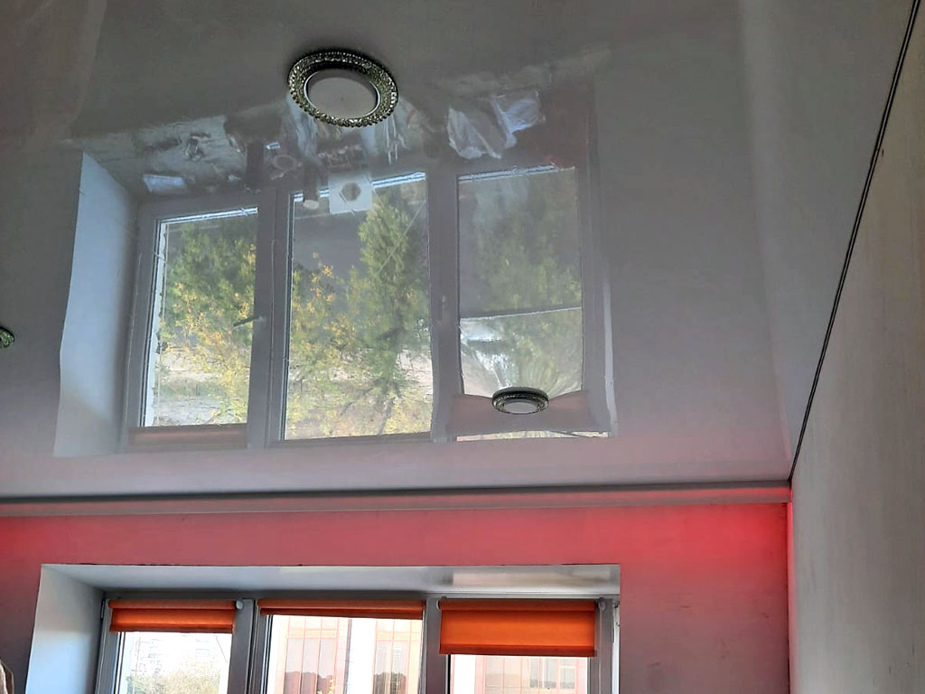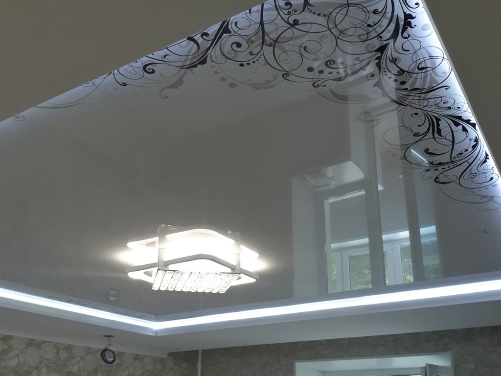 г. Медынь. Установка глянцевого потолка с использованием фотопечати. Подготовка закладной под люстру, монтаж светодиодной ленты по периметру.
