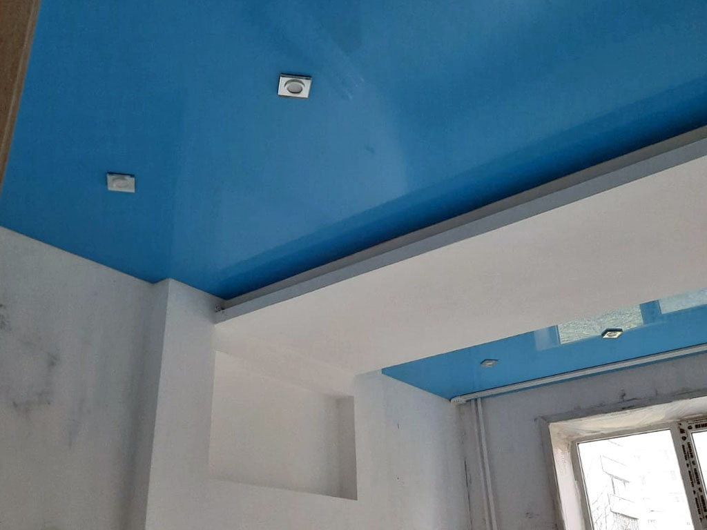 г. Медынь. Установка синего натяжного потолка в квартире с обводом труб.
