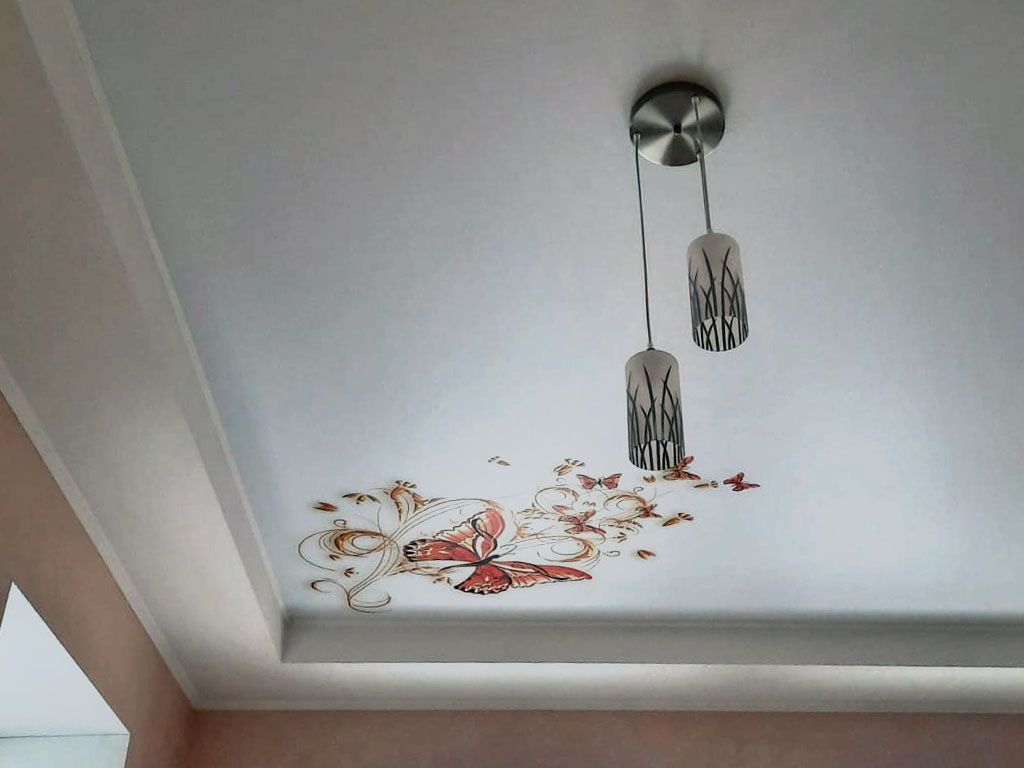 г. Медынь. Монтаж матового натяжного потолка с фотопечатью рисунка бабочки.